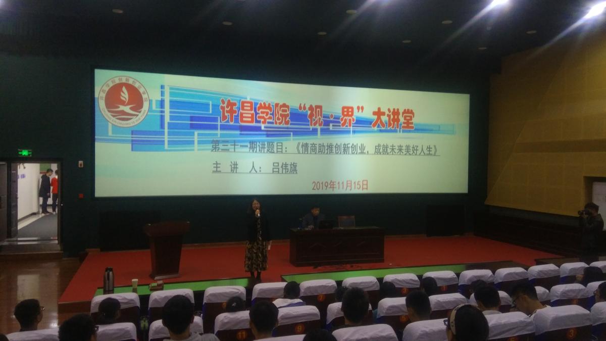 2019年11月15日下午,许昌学院第三十一期“视·界”大讲堂在创新创业学院二楼双创信息中心开讲。北京家亿国际文化发展有限公司名誉校长,高级内训师、心理辅导师吕伟旗为我校广大学生做了专题报告,报告的主题是《情商助推创新创业,成就未来美好人生》。本次报告由创新创业学院副院长闫爱敏主持。