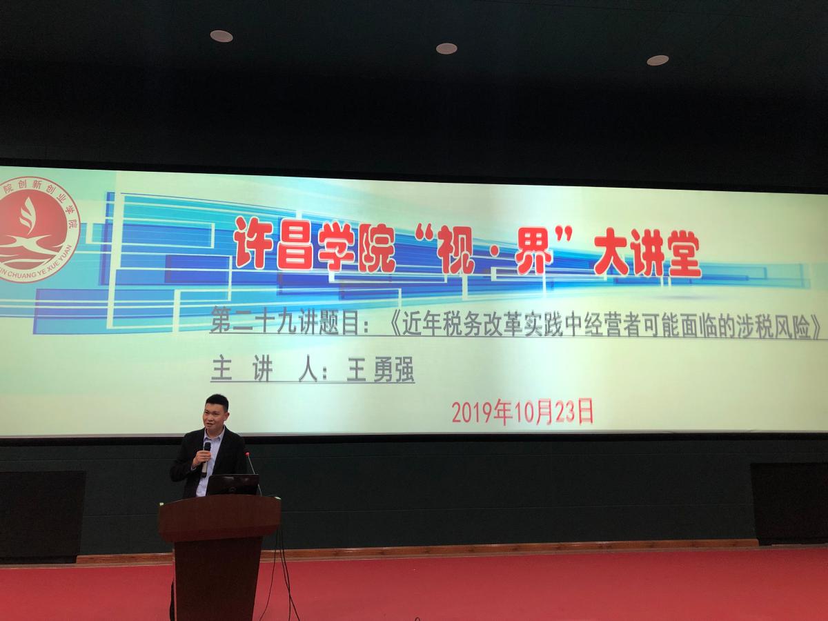 10月23日19:00,许昌学院第二十九期“视·界”创业大讲堂在创新创业学院二楼培训中心举行,创新创业学院特邀河南省百账通财税服务有限公司总经理,国家高级税务注册咨询师,大众创业导师王勇强为广大师生做专题讲座。