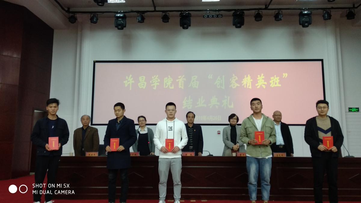 4月26日下午,我校在创新创业学院学术报告厅举行许昌学院首届创客精英班结业典礼。创新创业学院院长陈彪、就业指导中心主任曹军芬、许昌学院创新创业导师张建华、马光华以及参加本次训练营的28名学员到场参加,典礼由创新创业学院副院长闫爱敏主持。