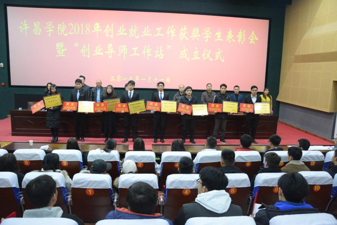 创新创业学院院长陈彪致辞并宣读了《关于成立许昌学院创业导师工作站的决定》,他指出成立“创业导师工作站”对加大我校创新创业园区创业团队的精准帮扶的力度、推动双创升级的重要意义。就业指导中心副主任刘小敏宣读了许昌学院第三届个人简历设计大赛表彰文件及获奖名单;创新创业学院副院长闫爱敏宣读了《关于表彰2018年度大学生创新创业活动明星团队和创业明星的决定》,与会领导为创业导师颁发了聘书,并为获奖单位和团队颁发了扶持基金和荣誉证书。
