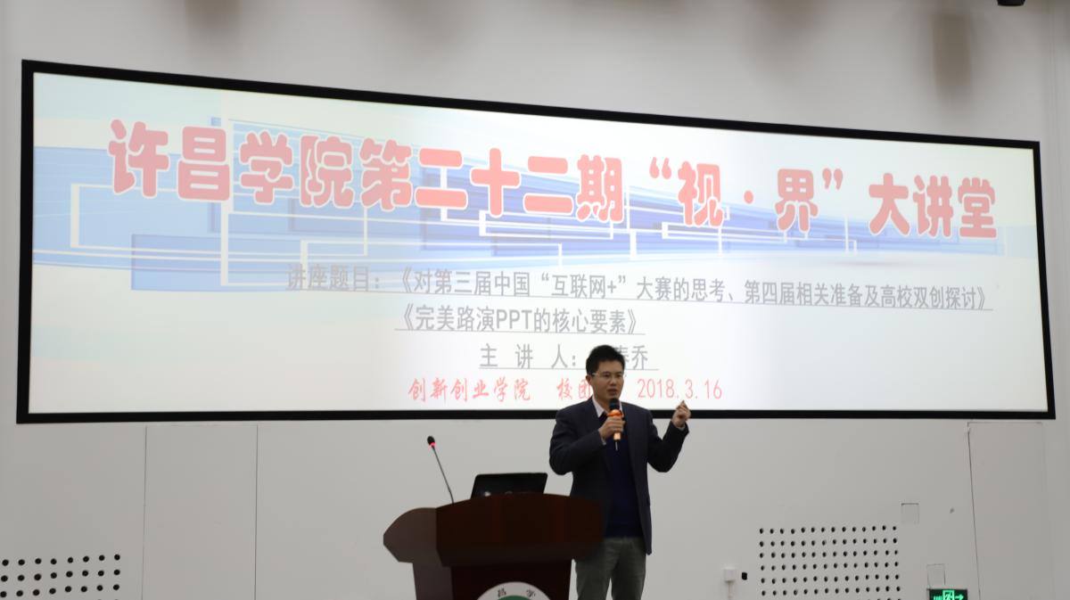 3月16日下午,许昌学院第二十二期“视·界”大讲堂之《创新创业大赛辅导专题》在创新创业学院一楼培训中心正式开讲。北京靓米网络科技有限公司张春乔董事长为我校300多名师生做了专题讲座,讲座由创新创业学院副院长闫爱敏主持。